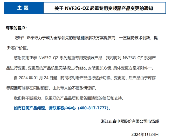 關(guān)于 NVF3G-QZ 起重專用變頻器產(chǎn)品變更的通知