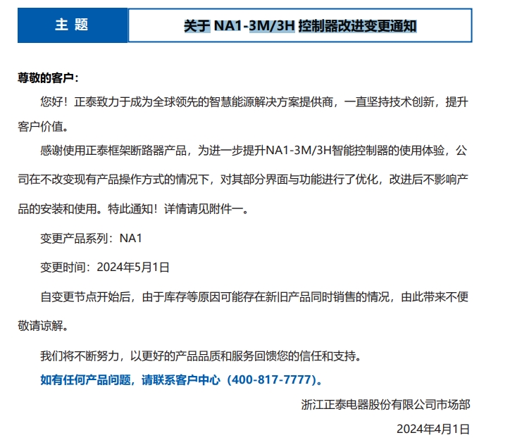 關(guān)于 NA1-3M/3H 控制器改進(jìn)變更通知