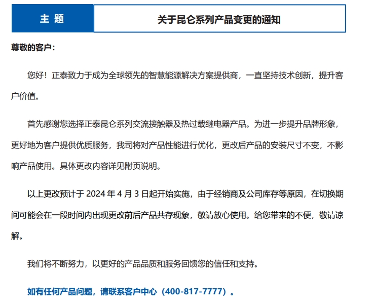 關(guān)于 NC8-1450~2650 交流接觸器產(chǎn)品變更的通知