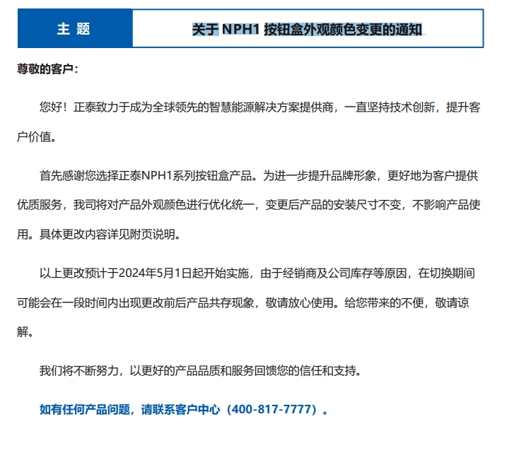 關(guān)于 NPH1 按鈕盒外觀顏色變更的通知