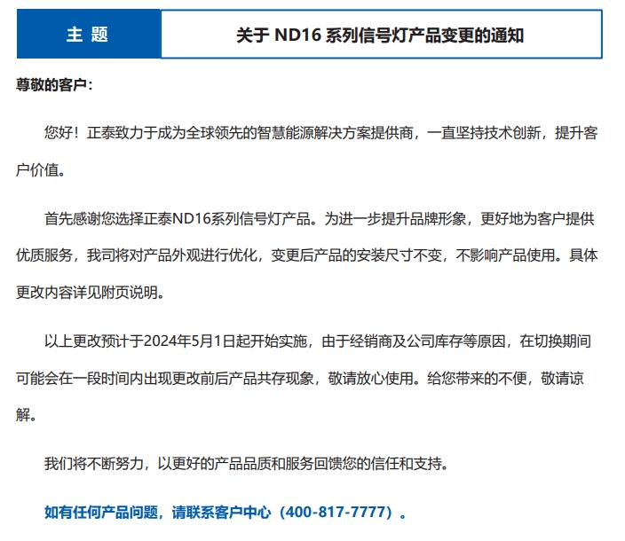 關(guān)于 ND16 系列信號(hào)燈產(chǎn)品變更的通知