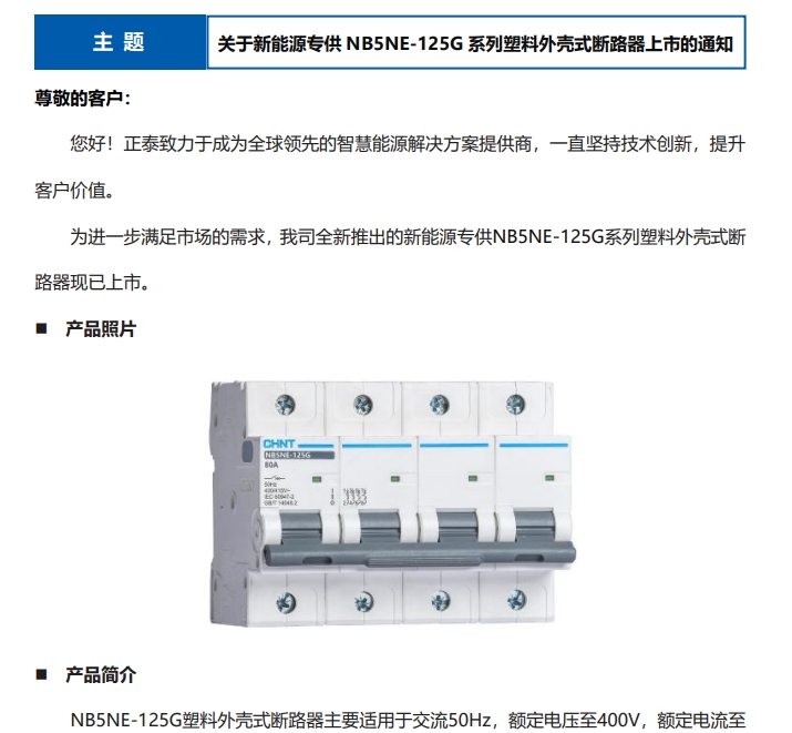 關(guān)于新能源專供 NB5NE-125G 系列塑料外殼式斷路器上市的通知