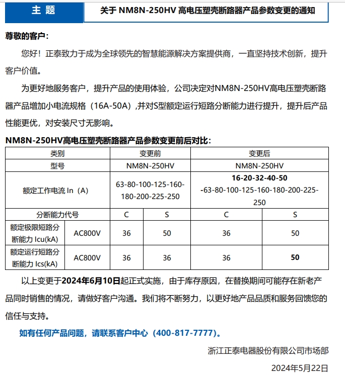 關(guān)于 NM8N-250HV 高電壓塑殼斷路器產(chǎn)品參數(shù)變更的通知