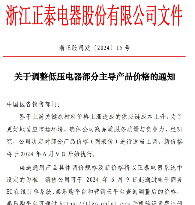 關于調整低壓電器部分主導產品價格的通知 -浙正股司發(fā)〔2024〕15 號