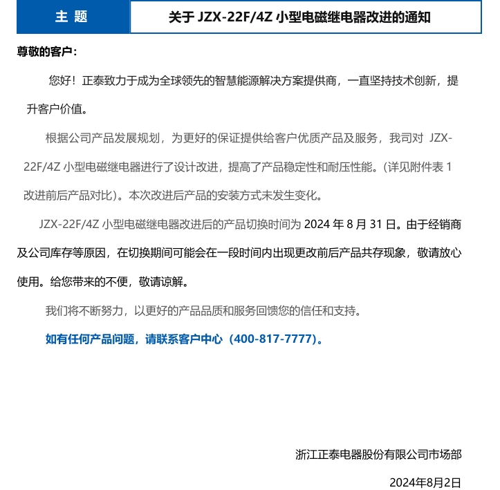 關(guān)于JZX-22F/4Z小型電磁繼電器改進(jìn)的通知
