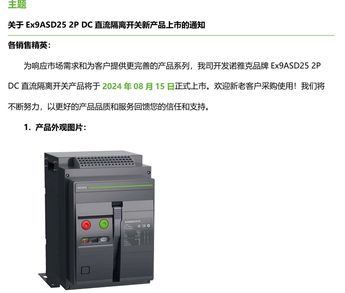 關(guān)于Ex9ASD25 2P DC直流隔離開關(guān)新產(chǎn)品上市的通知