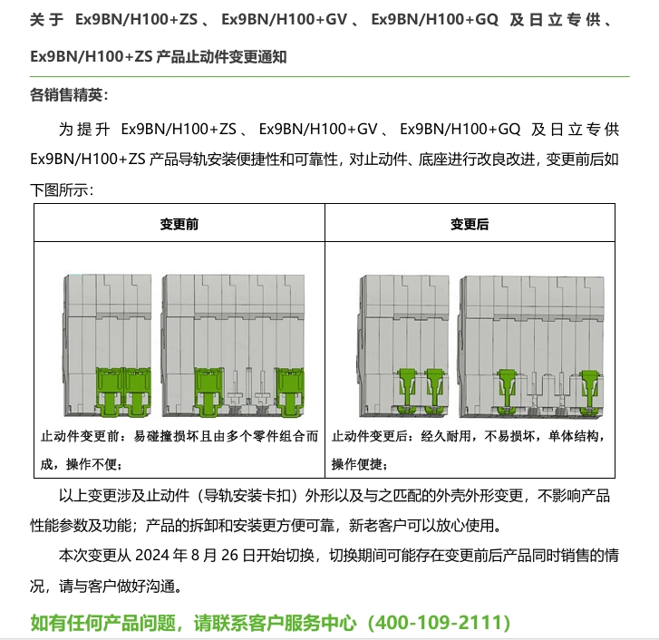 關于Ex9BN/H100+ZS、Ex9BN/H100+GV 、 Ex9BN/H100+GQ 及日立專供、 Ex9BN/H100+ZS產(chǎn)品止動件變更通知