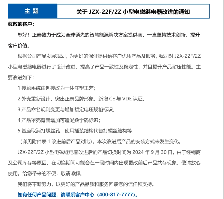 關于JZX-22F/2Z小型電磁繼電器改進的通知