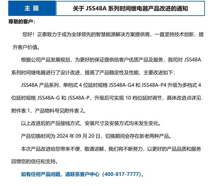 關(guān)于JSS48A系列時(shí)間繼電器產(chǎn)品改進(jìn)的通知