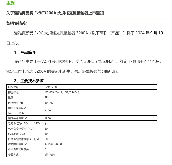 關(guān)于諾雅克品牌Ex9C3200A大規(guī)格交流接觸器上市通知