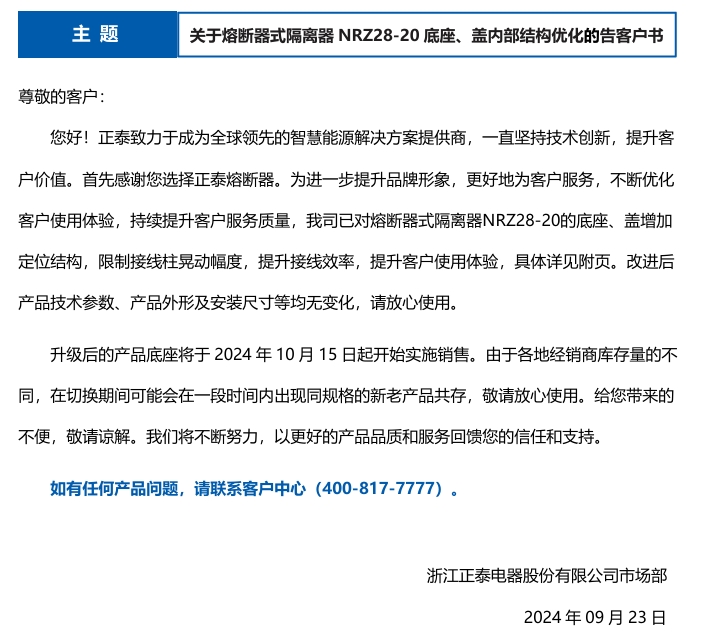 關(guān)于熔斷器式隔離器NRZ28-20底座、蓋內(nèi)部結(jié)構(gòu)優(yōu)化的告客戶書(shū)