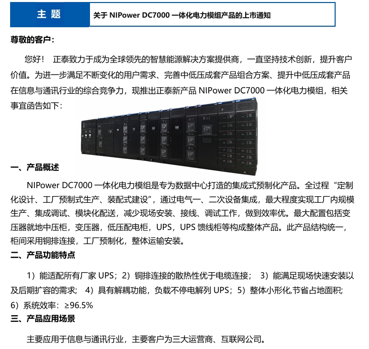 關(guān)于NIPower DC7000一體化電力模組產(chǎn)品的上市通知