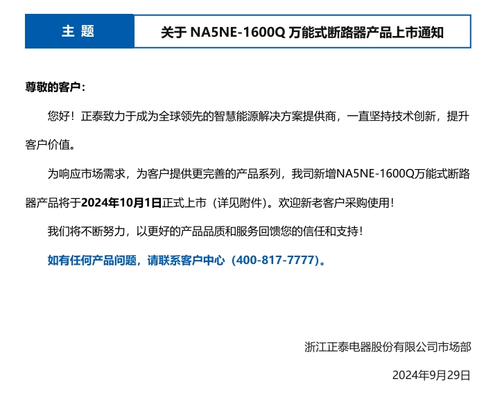 關(guān)于NA5NE-1600Q萬(wàn)能式斷路器產(chǎn)品上市通知
