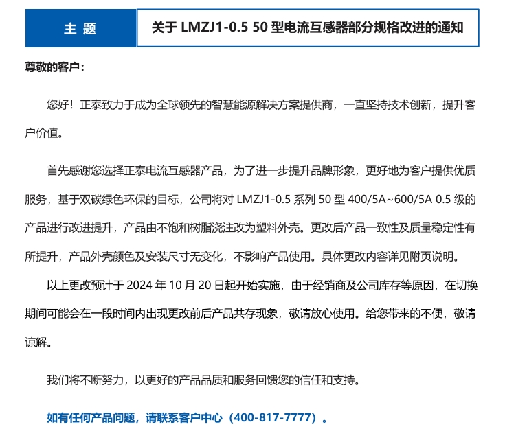 關(guān)于LMZJ1-0.5 50型電流互感器部分規(guī)格改進(jìn)的通知