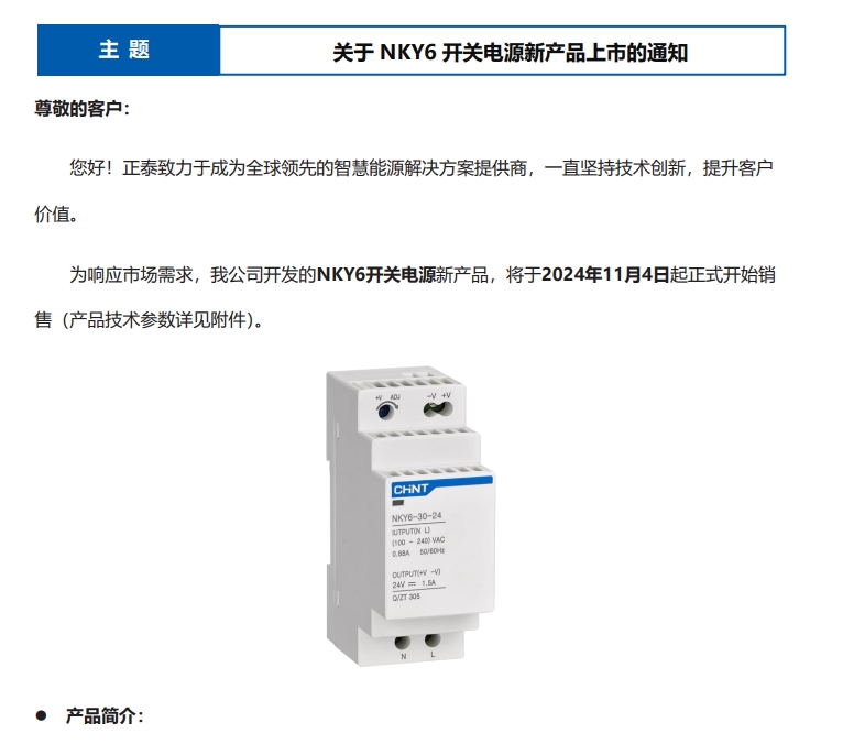 關(guān)于 NKY6 開關(guān)電源新產(chǎn)品上市的通知