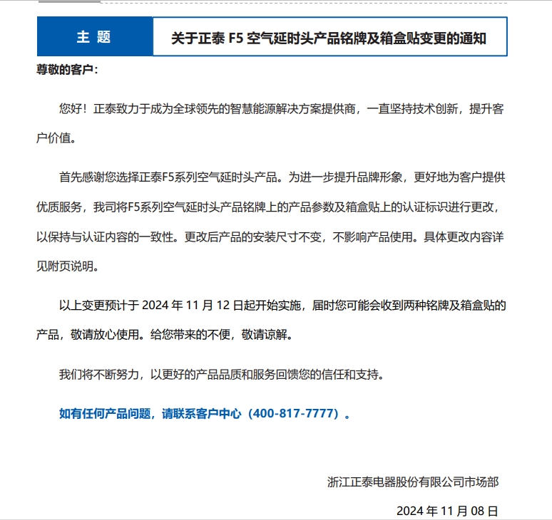 關(guān)于正泰 F5 空氣延時頭產(chǎn)品銘牌及箱盒貼變更的通知