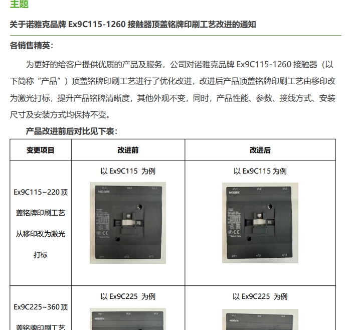 關于諾雅克品牌 Ex9C115-1260 接觸器頂蓋銘牌印刷工藝改進的通知