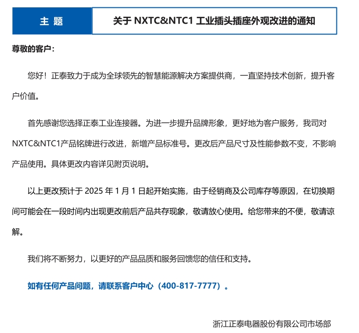 關(guān)于 NXTC&NTC1 工業(yè)插頭插座外觀改進(jìn)的通知