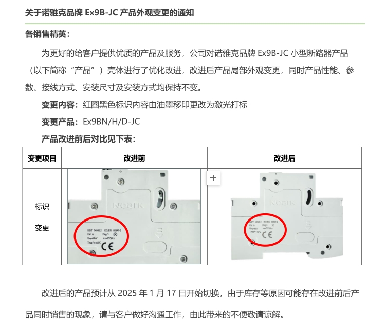關(guān)于諾雅克品牌 Ex9B-JC 產(chǎn)品外觀變更的通知