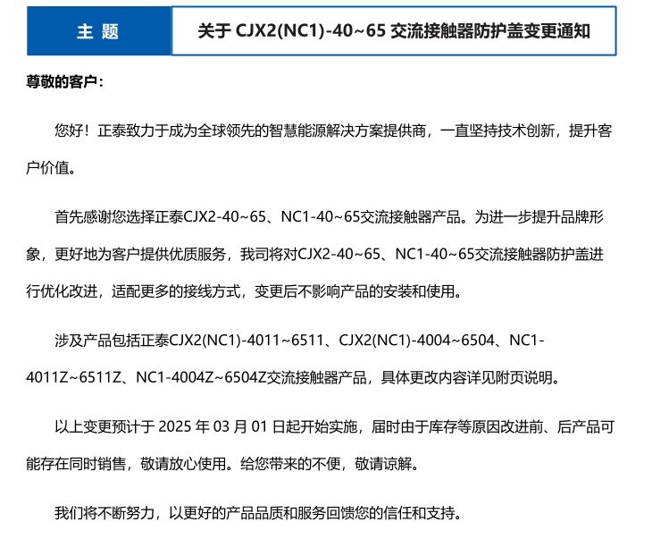 關(guān)于 CJX2(NC1)-40~65 交流接觸器防護蓋變更通知