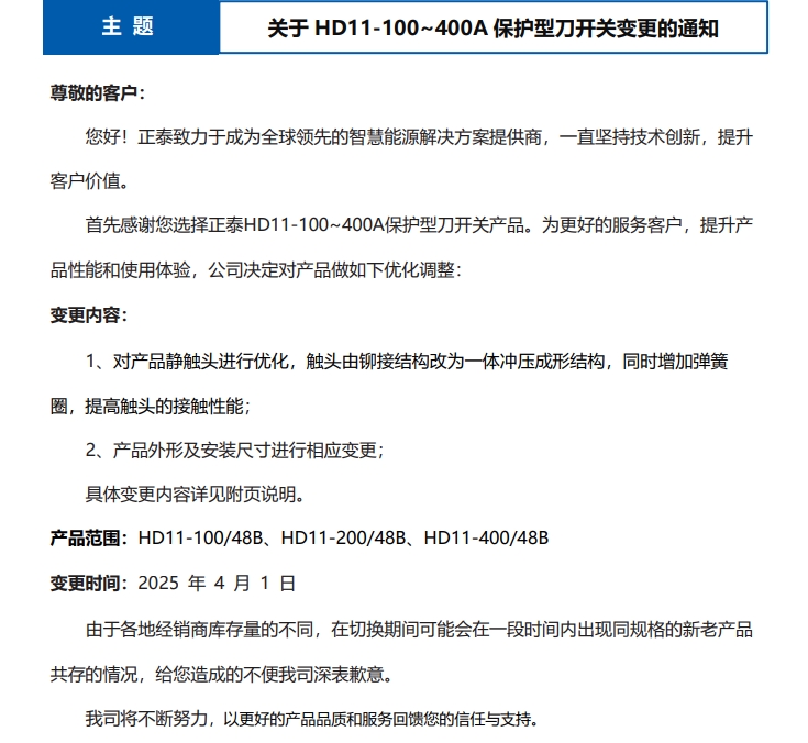 關(guān)于 HD11-100~400A 保護(hù)型刀開關(guān)變更的通知
