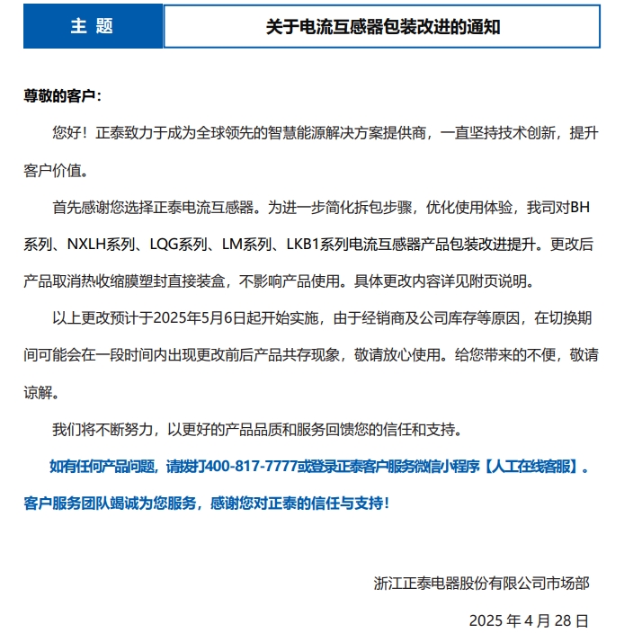 關于電流互感器包裝改進的通知