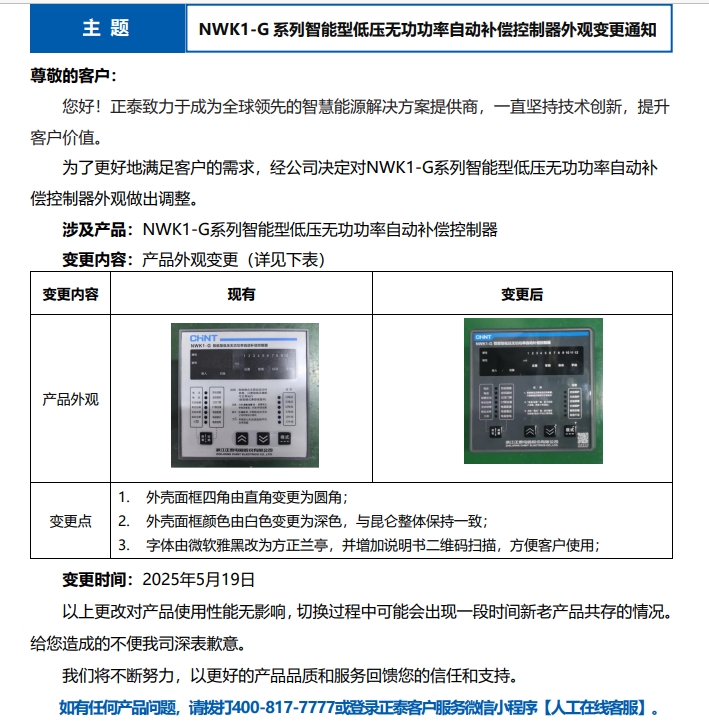 NWK1-G 系列智能型低壓無(wú)功功率自動(dòng)補(bǔ)償控制器外觀變更通知