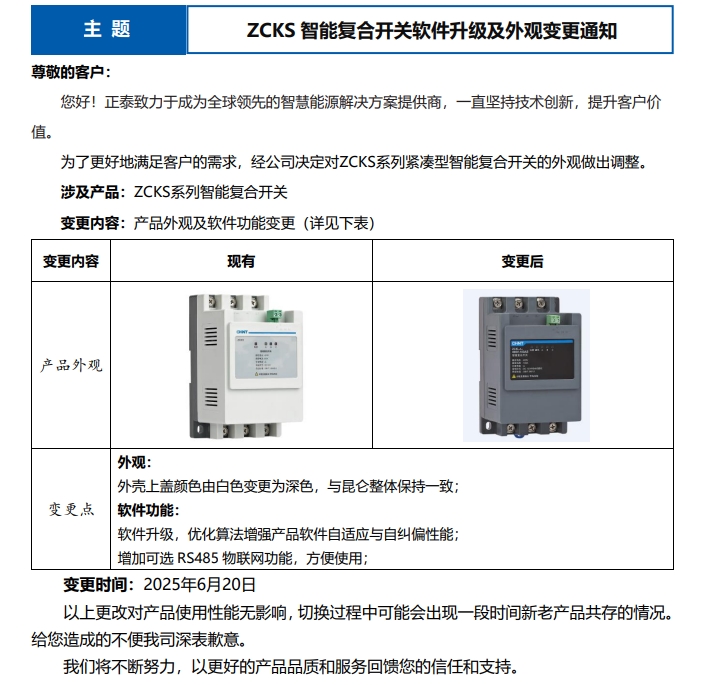 ZCKS 智能復(fù)合開關(guān)軟件升級(jí)及外觀變更通知