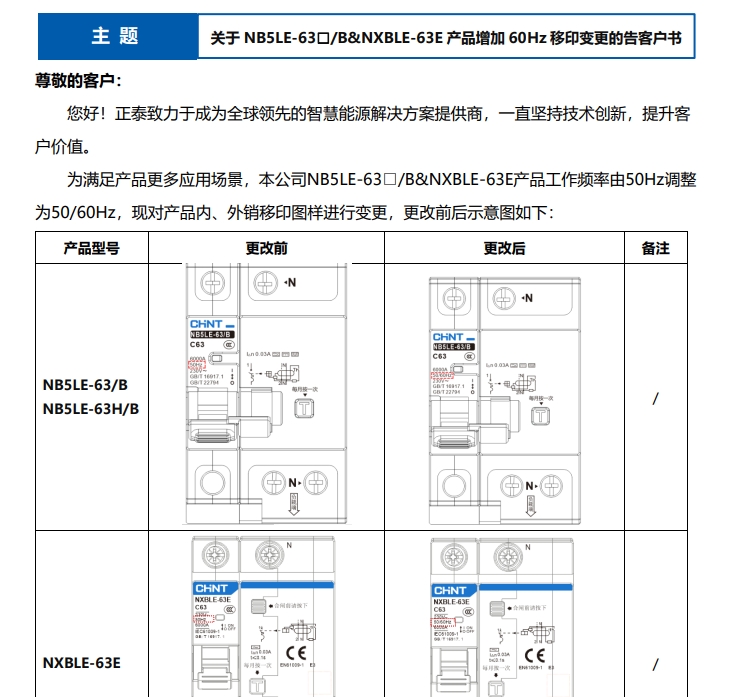 關(guān)于 NB5LE-63□/B&NXBLE-63E 產(chǎn)品增加 60Hz 移印變更的告客戶書