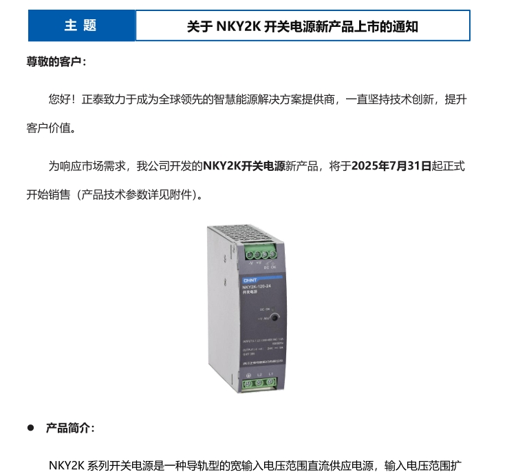 關于 NKY2K 開關電源新產品上市的通知