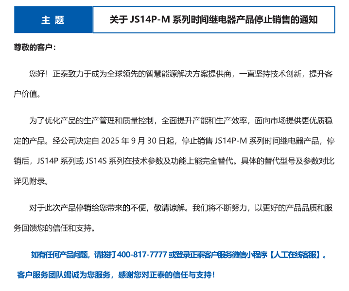 關(guān)于 JS14P-M 系列時間繼電器產(chǎn)品停止銷售的通知
