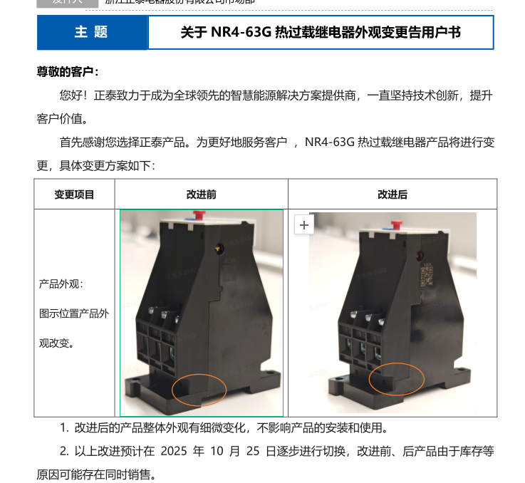關(guān)于 NR4-63G 熱過(guò)載繼電器外觀變更告用戶書